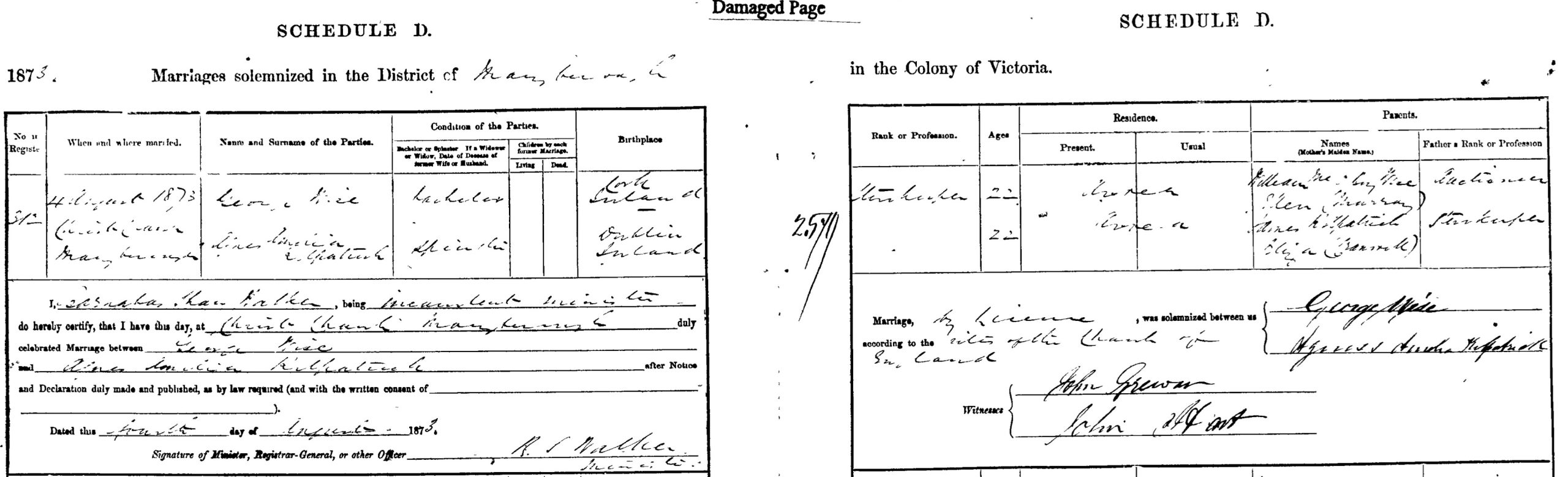 William Wise died in 1873, after being thrown from his horse. His moving funeral and cortege to Avoca Cemetery was attended by over 500 people, some travelling many miles to attend. This was also the same year that two of William and Ellen’s sons married, Henry Wise marrying Jane Isabelle Kilpatrick and George Edwin Wise marrying Jane’s sister Agnes Amelia Kilpatrick, in the goldrush township of Avoca. Jane and Agnes Kilpatrick being the daughters of his business partner and Irish compatriot James Kilpatrick.