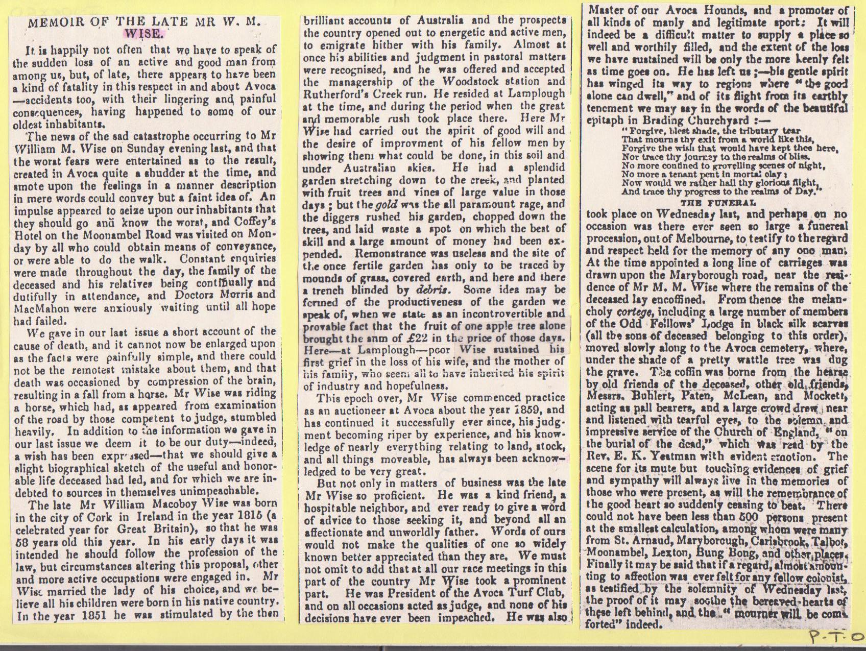 Death of James Wise, Avoca Mail, 17 August 1894